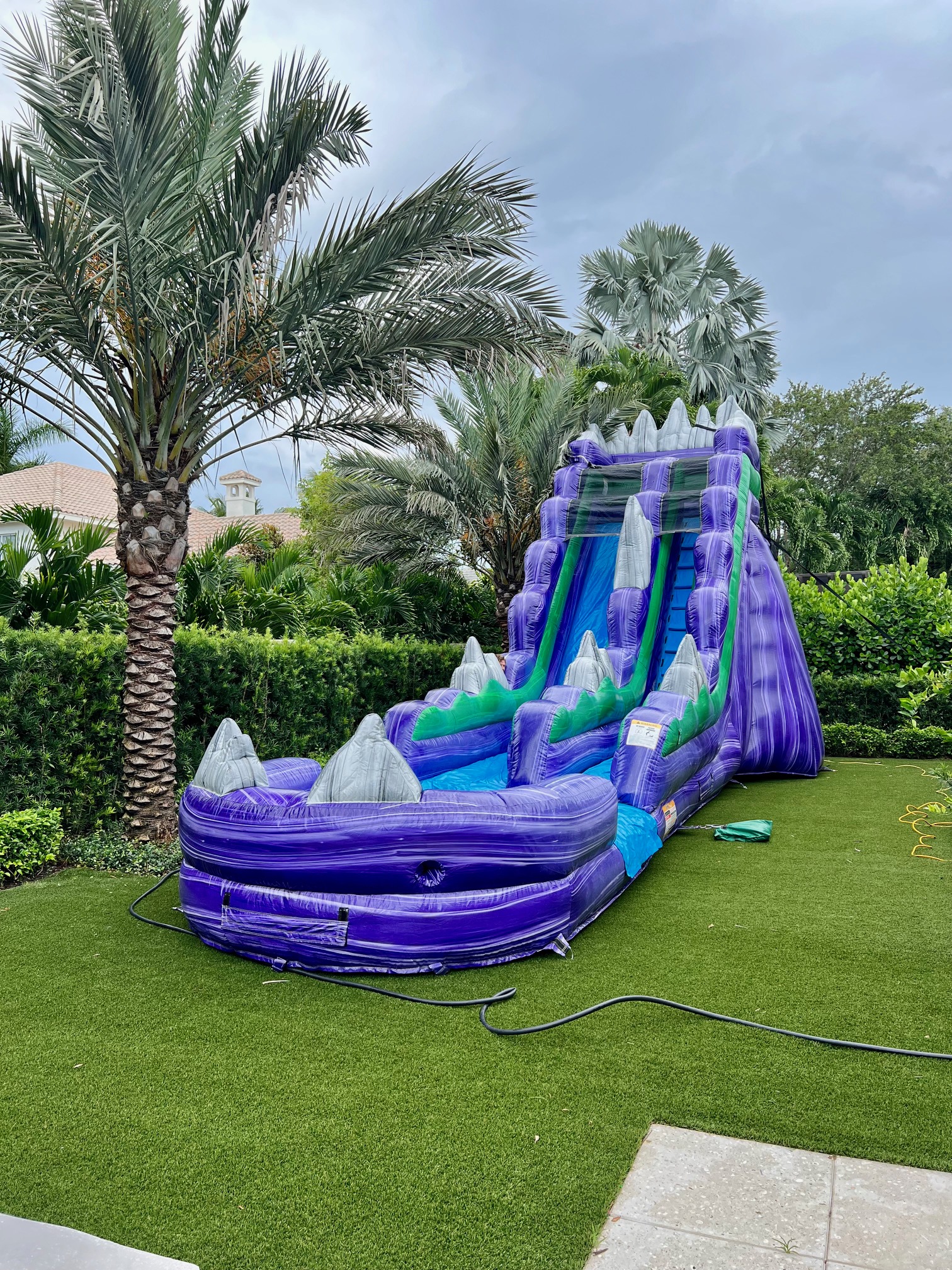 The 19' Dark Night giant climber slide is a first choice for children and adults to have a fun splash party on sunny days! This waterslide ensures a wow factor for big kids and adults, for young kids you may have to accompany them on the first few slides! These moonwalks come with shade to keep direct sun off kiddos. This slide is so much larger and impressive in person than the picture, you have to see it! This unit can hold 8-10 kids, no more than 4 adults, with a 1000 lb. combined weight limit. |